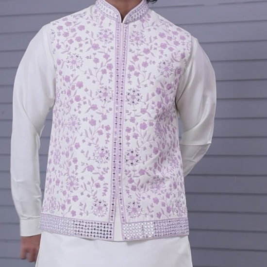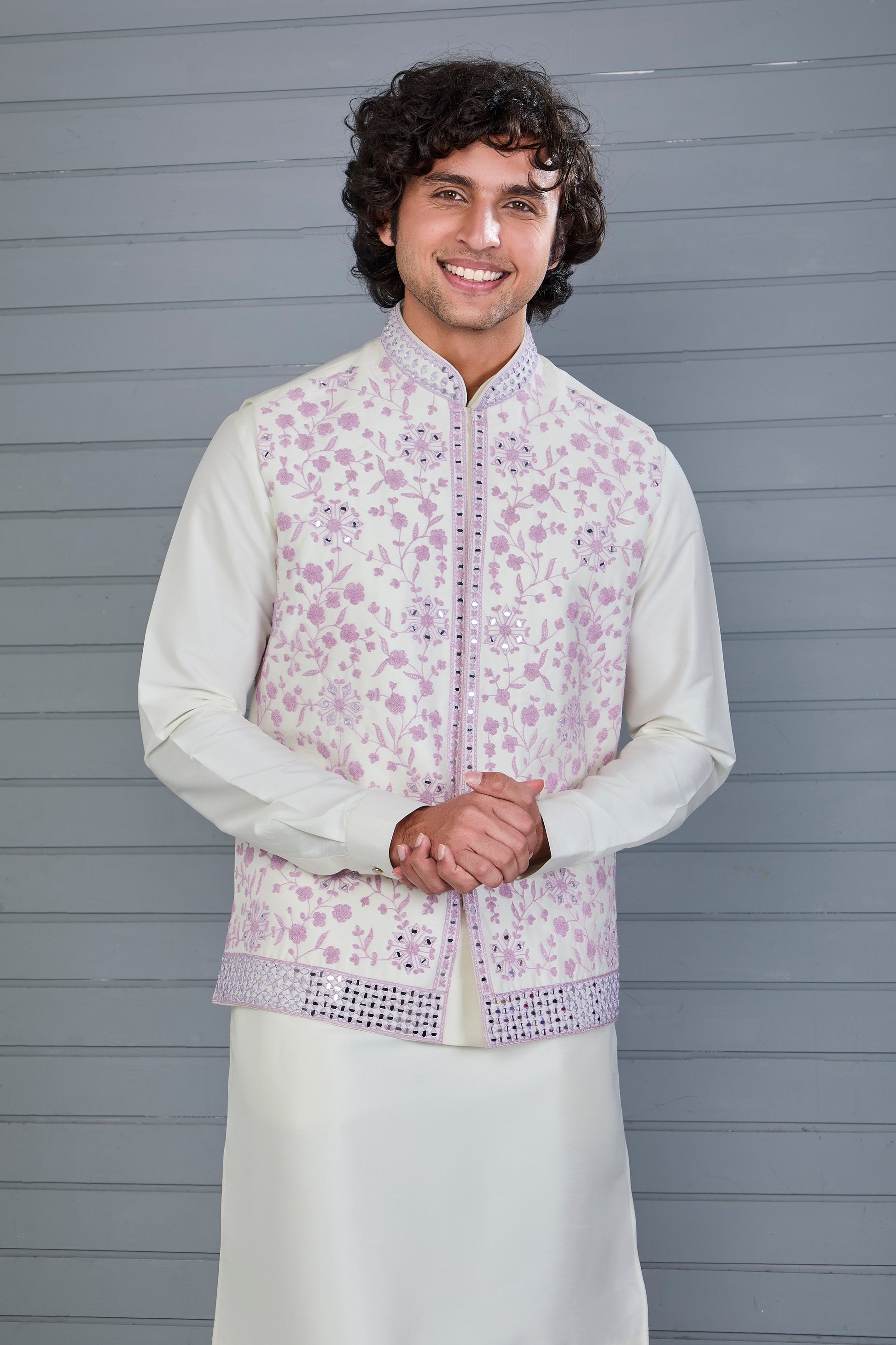 Make your festive look stand out and become irresistible in this captivating off-white raw silk kurta jacket set, decorated with resham, mirror and embroidery work to bring colorful cheer upon you. Pairing perfectly with the mandarin collar, full-sleeved kurta, this sleeveless kurta jacket comes with a set of pants, generating festive charm and elegance that would be perfect for lavish festivities and engagement.