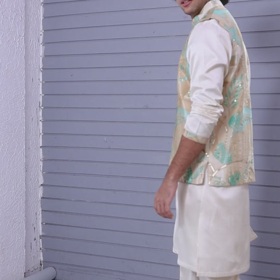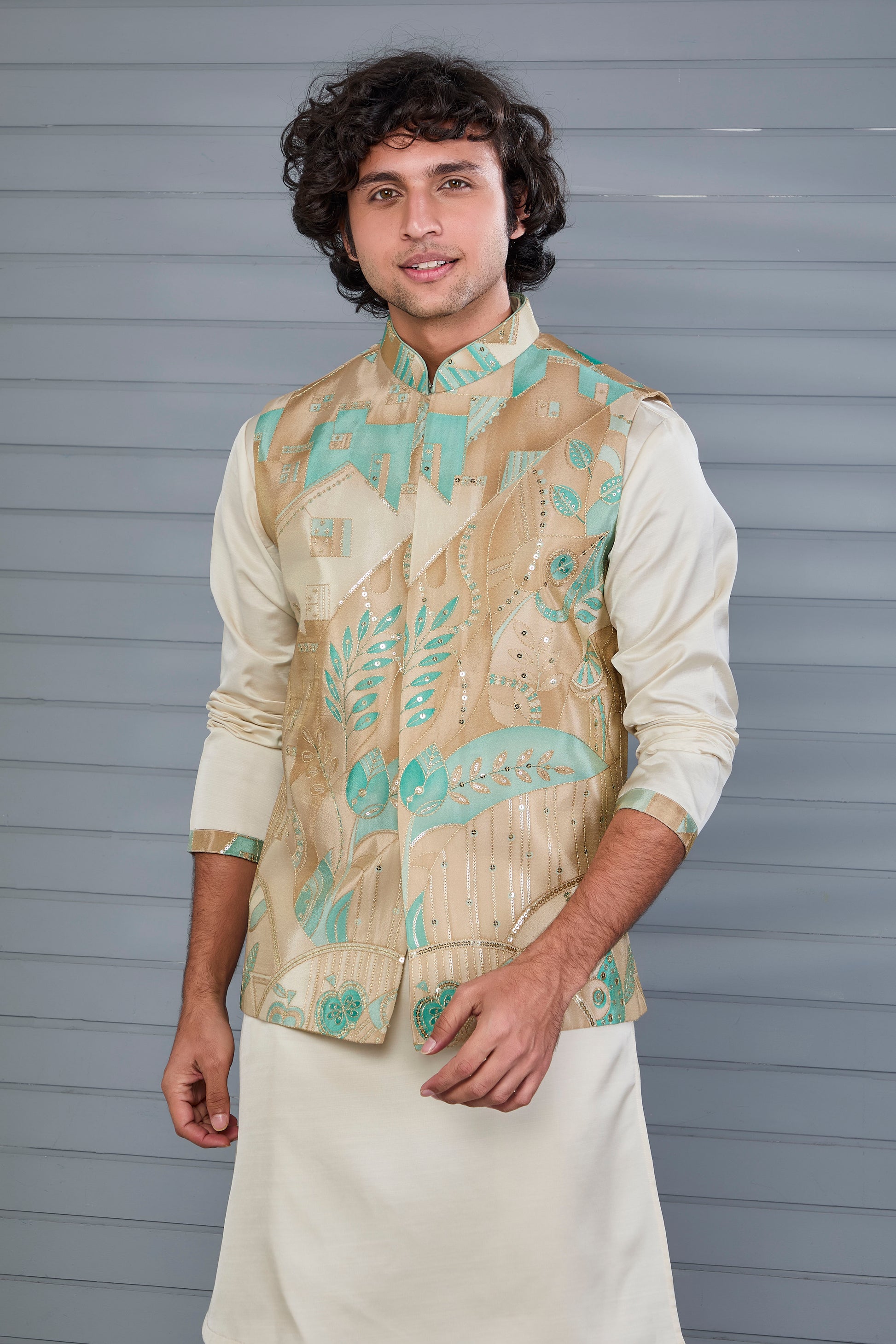 Raw silk kurta jacket set in beige printed of a traditional item with a modern style. The sleeveless jacket consists of a refined zari, sequins with a mandarin collar, full sleeve kurta to make one classy. Those are accompanied by pant, perfect evening festive, weddings and engagement celebration with classic appeal.