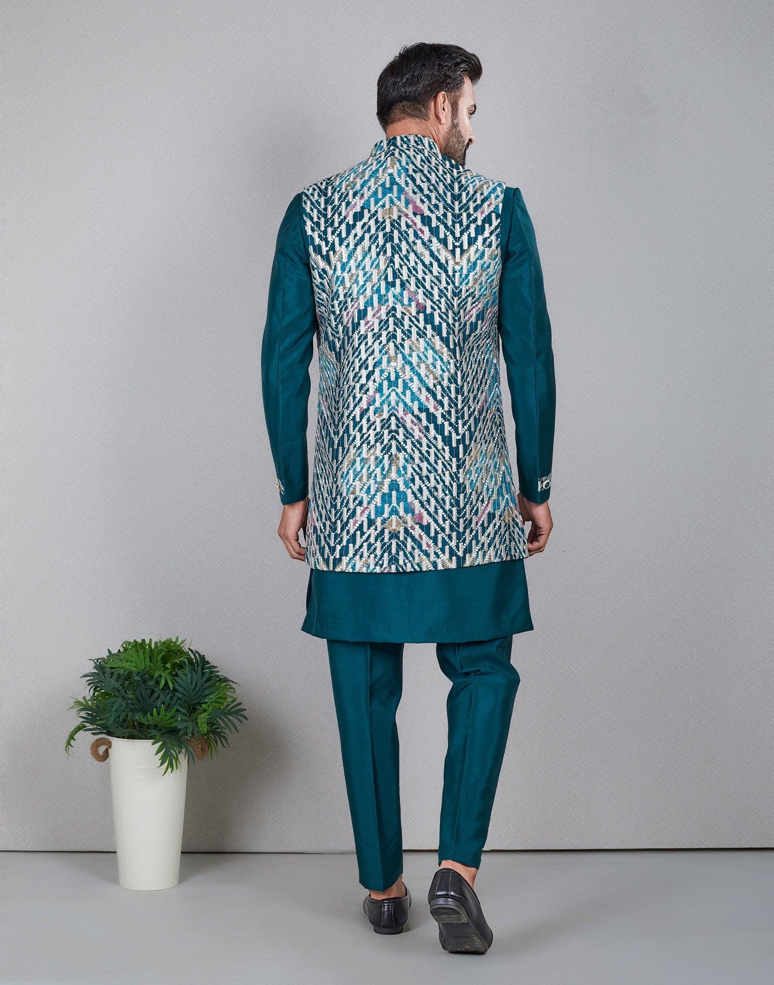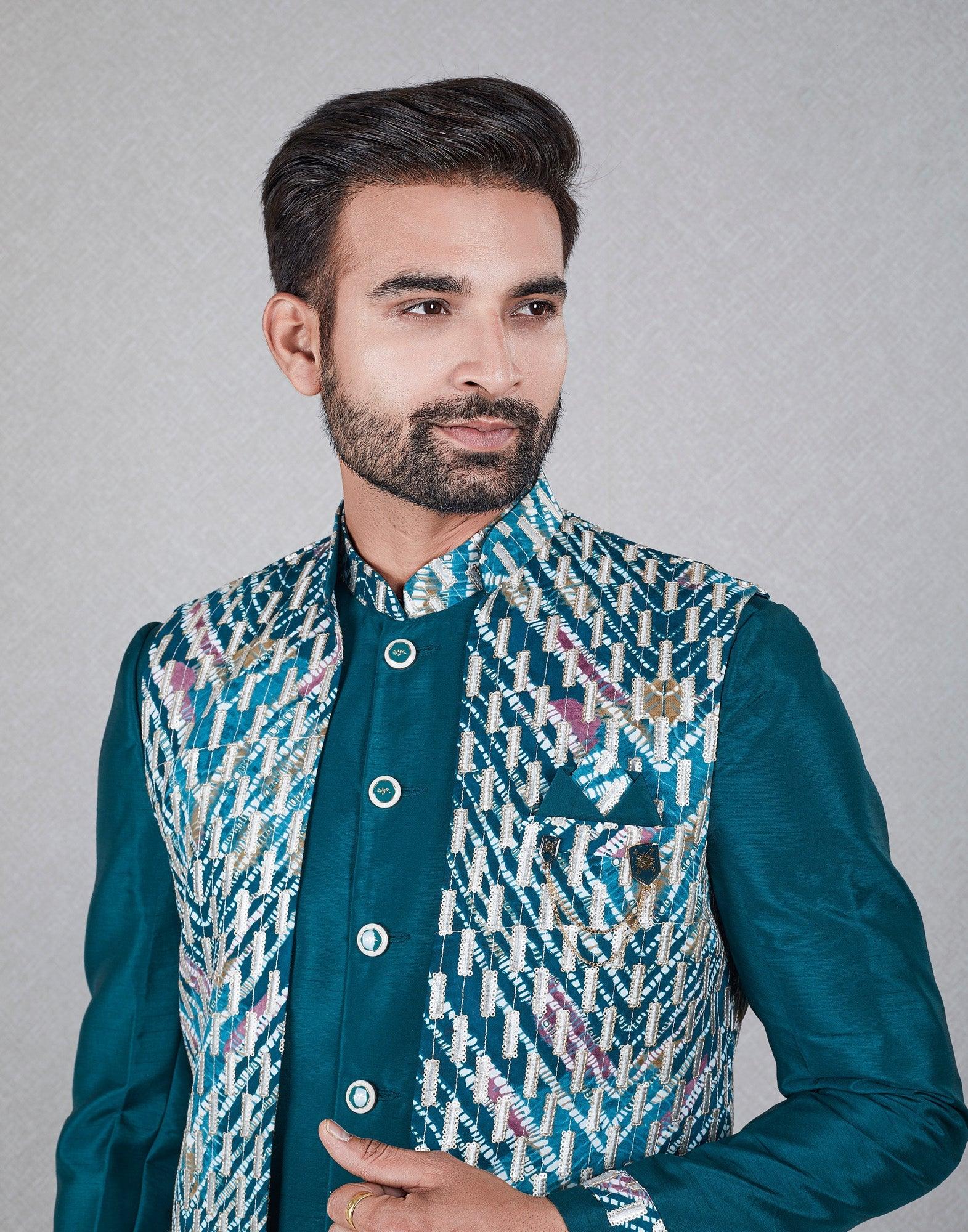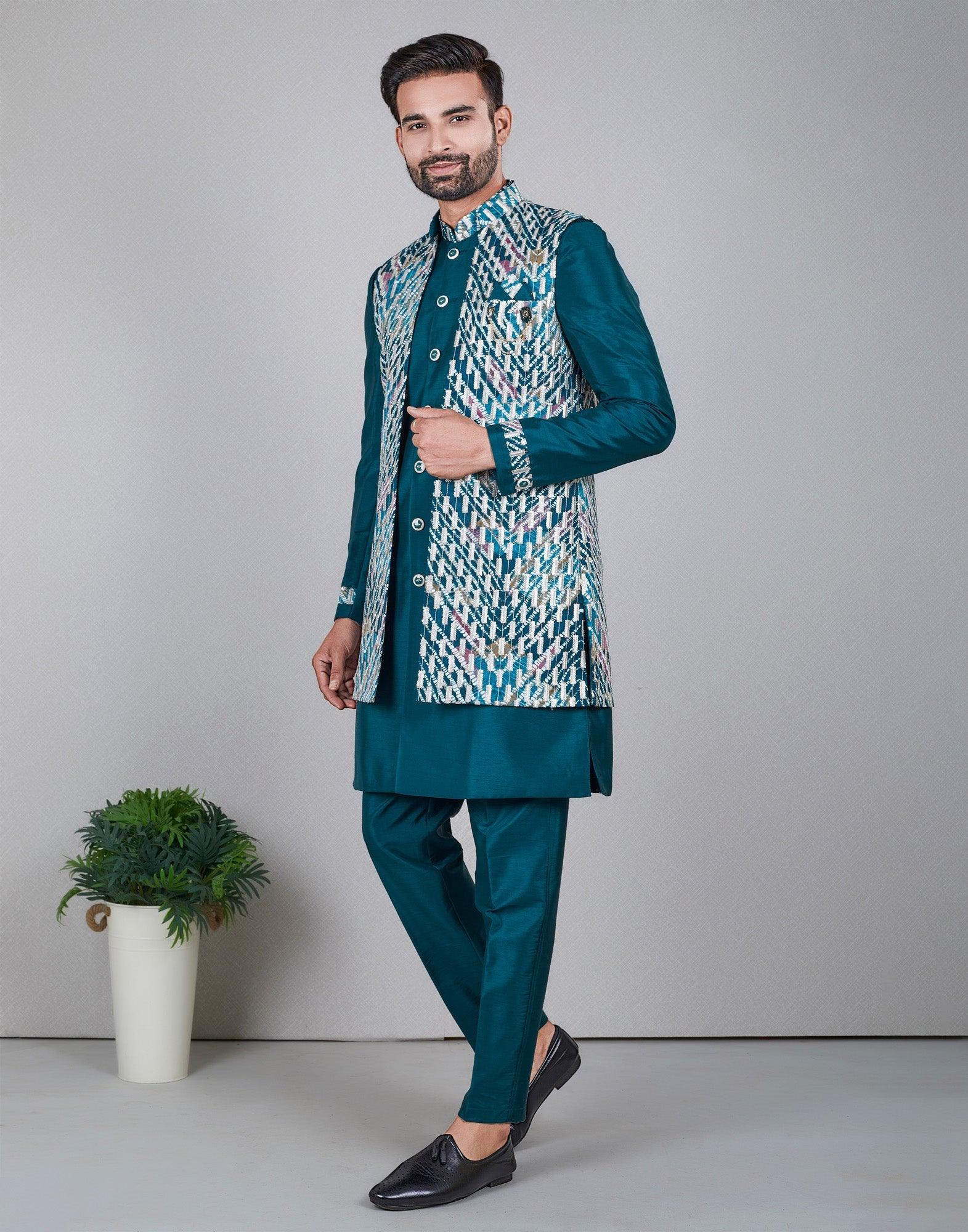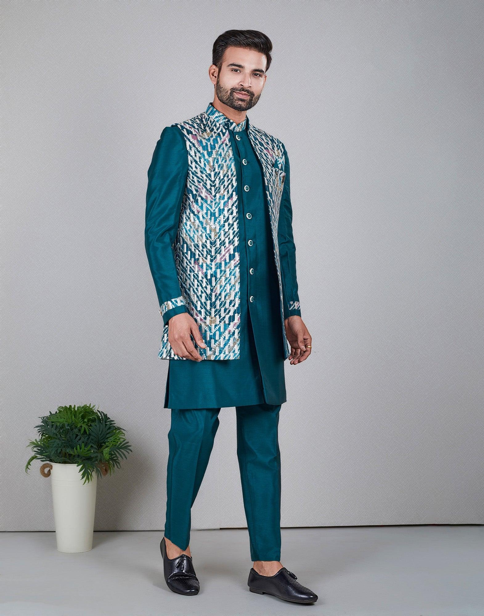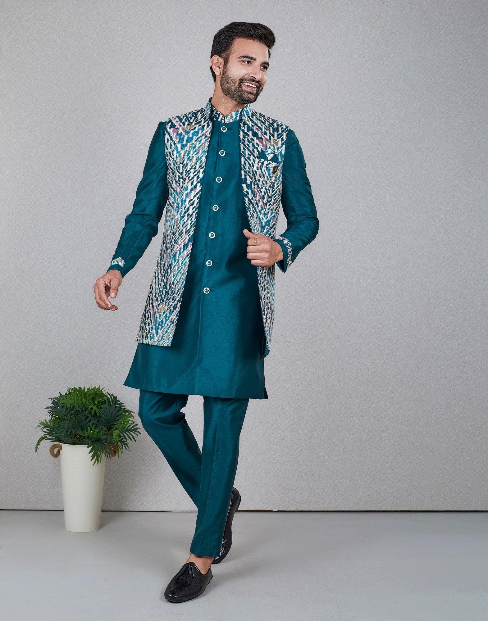 A peacock color Indo-Western ensemble paired with a printed long jacket featuring embroidery creates a stunning and unique look. The rich peacock color adds a touch of opulence and sophistication, while the printed jacket adds visual interest and personality to the outfit. The combination of bold colors and intricate embroidery strikes a perfect balance between traditional and contemporary styles. This ensemble is perfect for special occasions where you want to make a memorable and stylish impression. Complete the look with complementary accessories to enhance your overall appearance and elevate your style.