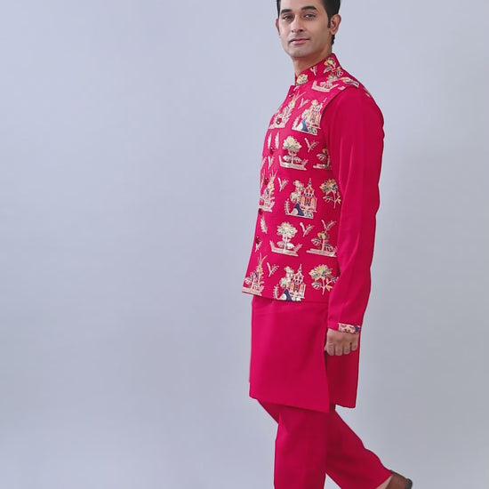 This kurta jacket set is made of off-white raw silk woven with delicate resham, sequins and embroidery. Sleeveless kurta jacket has a mandarin collar, full sleeve kurta and offers a mixture of traditional poise and modern elegance. This outfit could be paired with pant, which brings modest pomp to the wedding celebrations and cultural events.