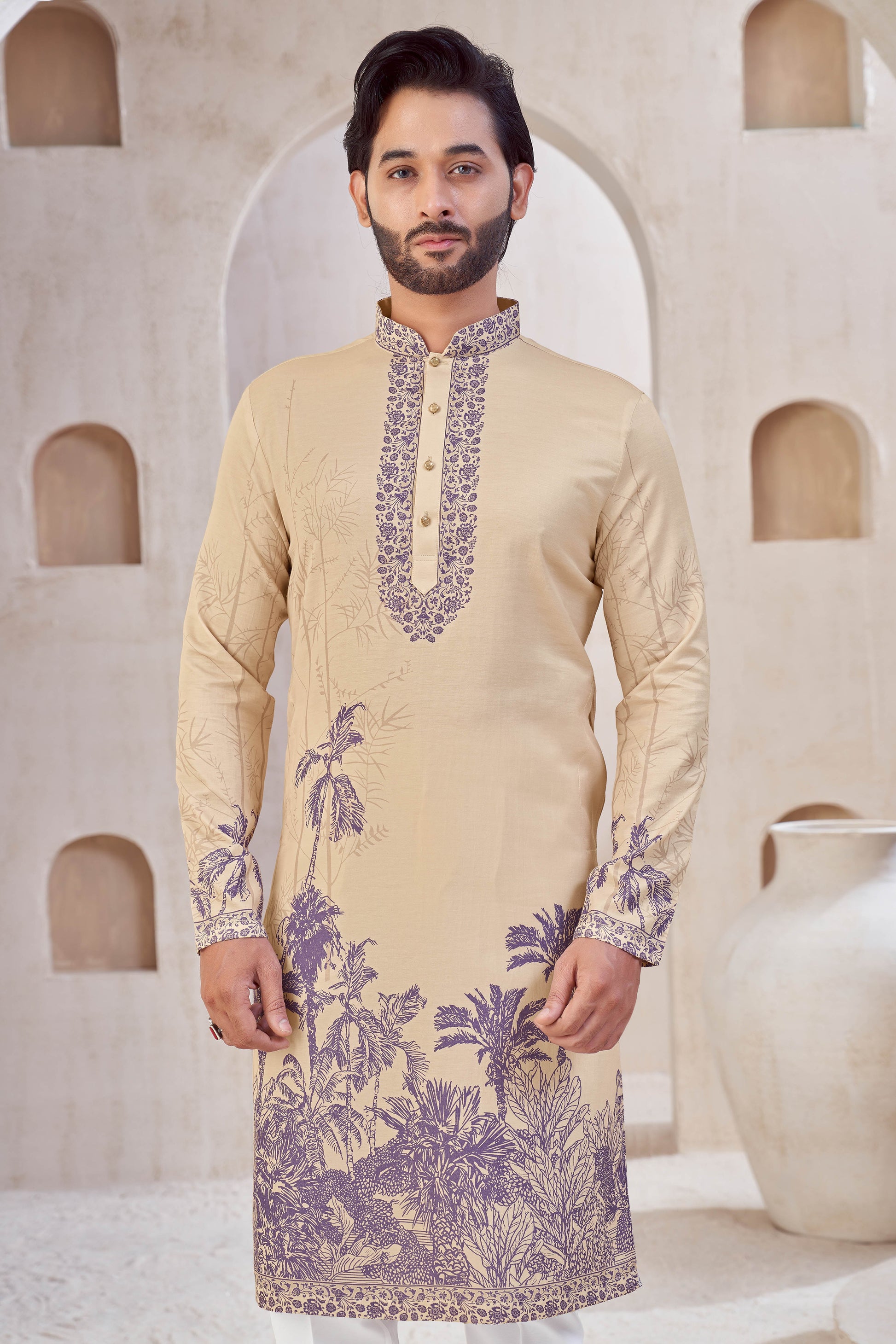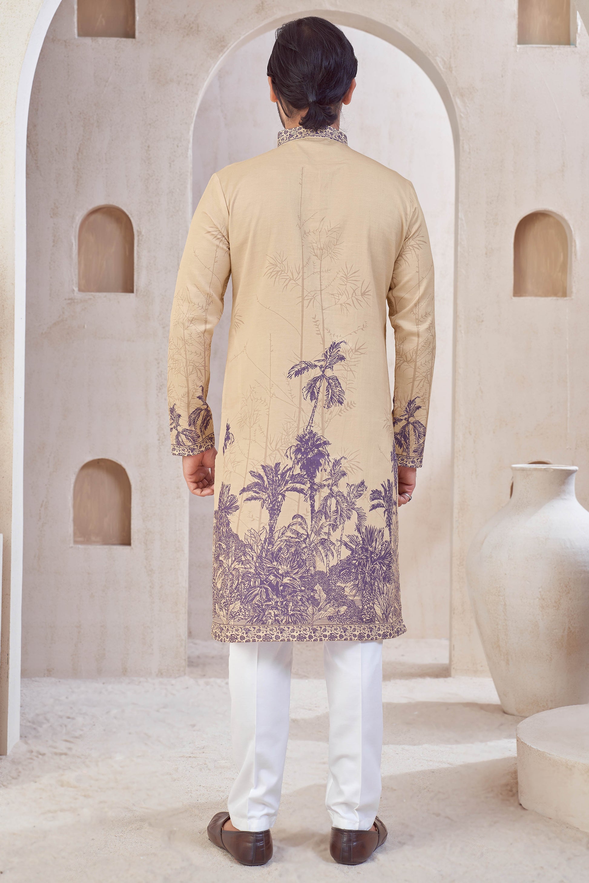 The Regal Palm Kurta showcases timeless elegance with its beige base and intricate palm and floral prints. A perfect blend of tradition and style, this kurta adds sophistication to your ethnic wardrobe.