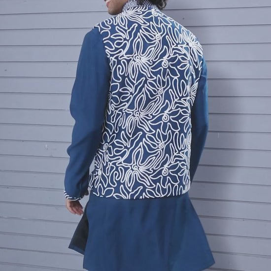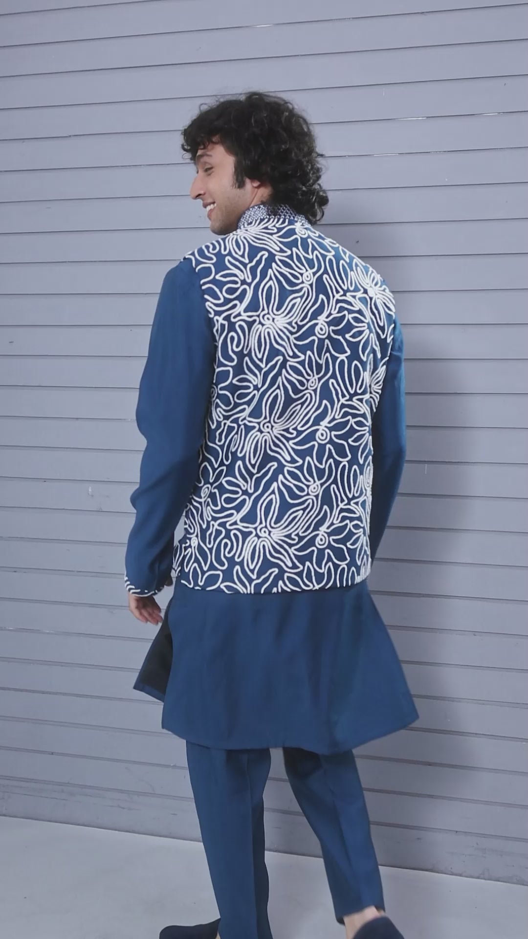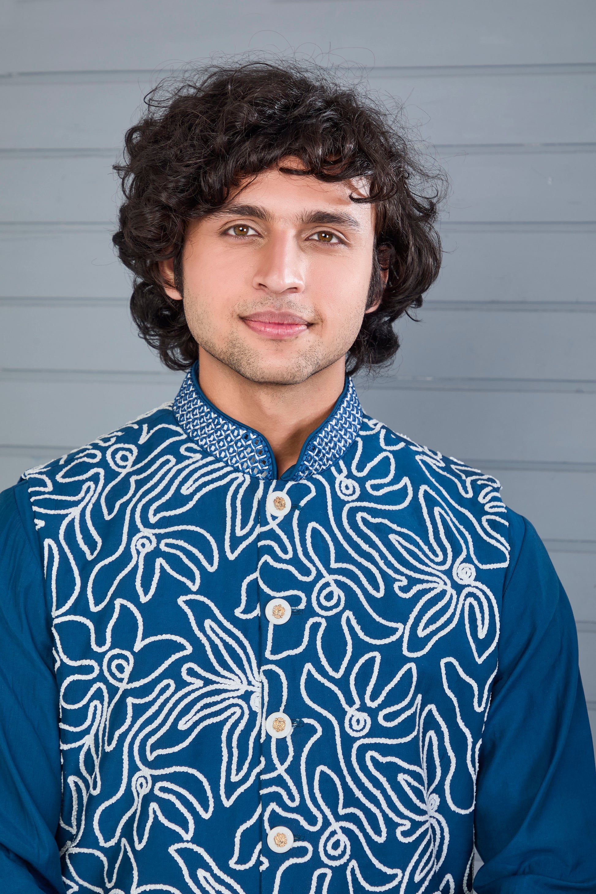 Make all your occasions special with this dark blue kurta jacket set for men that is made in pure raw silk. Specially designed to be full of resham, mirror work, and embroidery, it features a mandarin collar, full sleeves. When combined with a pant, it can be flaunted on several occasions such as festivals, wedding, and engagements.