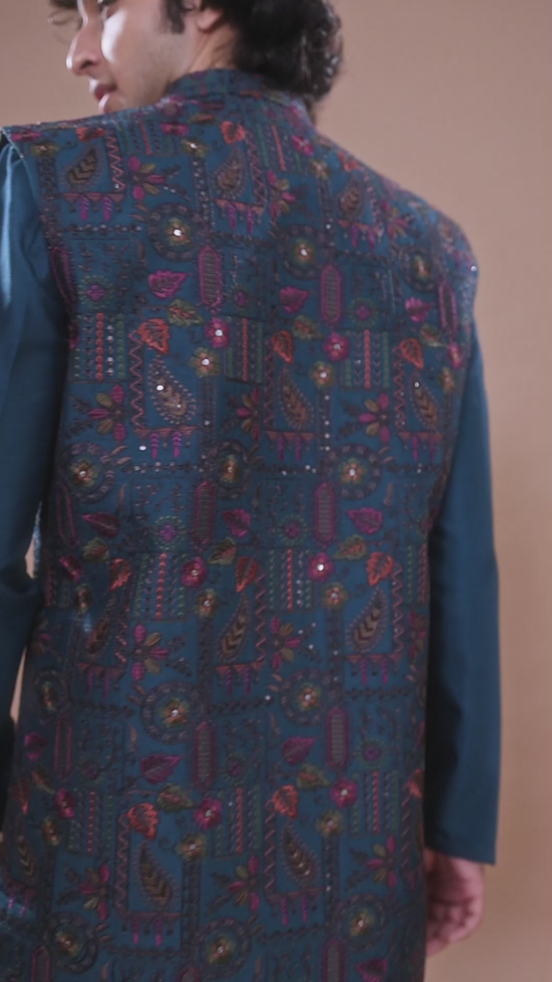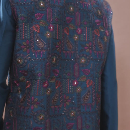 Keep on the edge with this exquisite teal blue wedding, reception and engagement raw silk indo-western, with a lot of resham, sequins and embroideries which further gives glamour to your appearance. It comes with a pant. This indo-western features a coordinating pant for a polished festive outfit