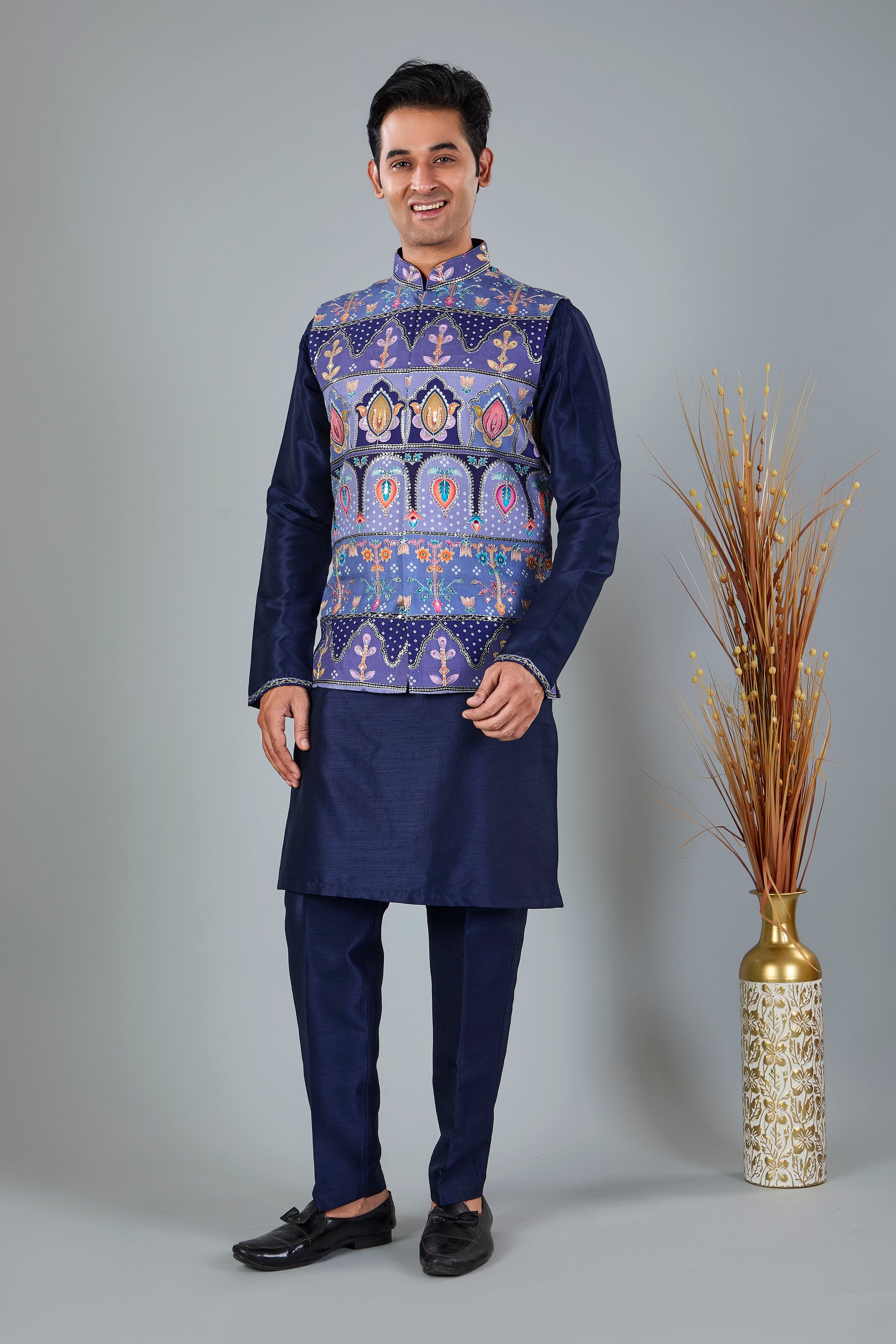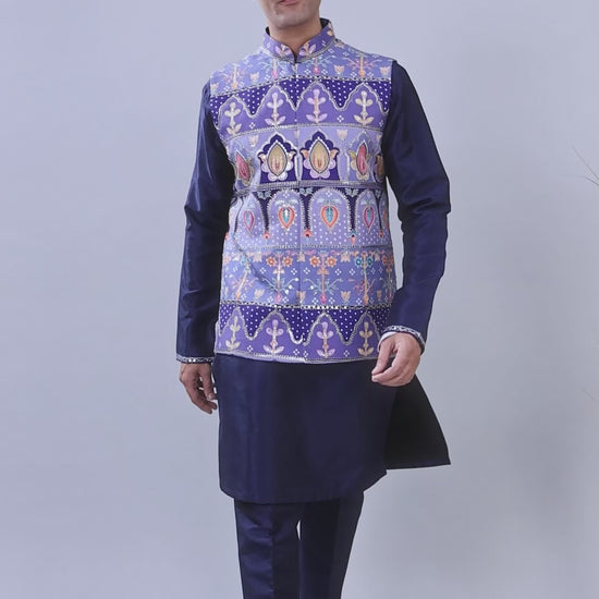 This is a navy men kurta jacket set that is ideal during a wedding or even engagement party. The zari and sequins work on raw silk fabric has been full style and comfortable with the mandarin collar, and full sleeves. To accessorize a complete wear during such celebrations, a pant must be worn.
