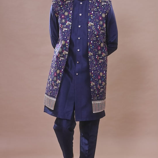 This indo-western raw silk is splendidly festooned with resham, zari and embroidery bits in navy color. A mandarin collar, full sleeved is a balance of vibrancy and elegance and the indo-western complements it. Pant is done and the ideal to be used whenever one is going to reception, engagement or even a wedding party that has a grandiose culturally speaking.