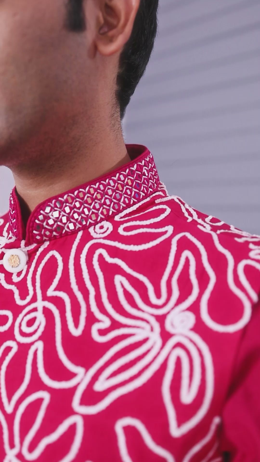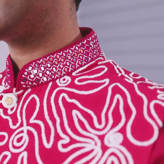 This magenta color outfit is designed from raw silk kurta jacket set with features very intricate resham, mirror, and embroidery details. The full-length sleeves combined with the mandarin collar give it a sophisticated look, while the matching pant make it a perfect outfit for a festive and wedding.