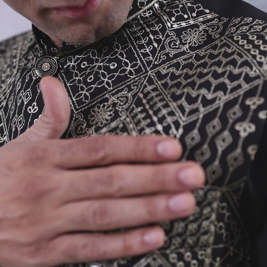 This black pure raw silk kurta jacket set is cool dashing, and it makes a perfect matching set during big celebrations. The sleeveless kurta jacket and mandarin collar crafted in zari, sequins work, full sleeve kurta and sleeveless one is really pretty. It can also be coupled with pant that is ideal during the bright lights in engagement and reception ceremonies.