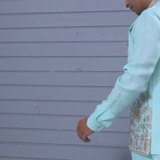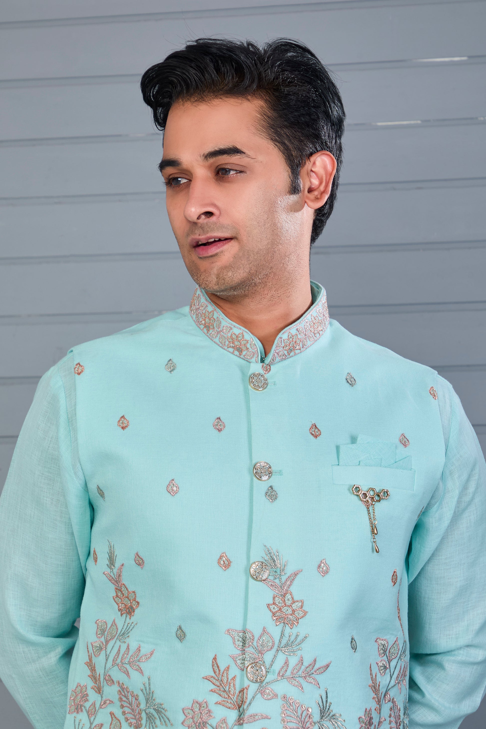 Wedding and Engagement Wear Sea Blue Men’s Kurta Jacket Set